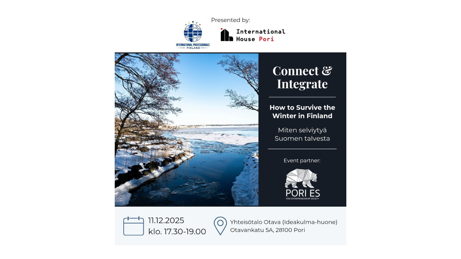 Join us on December 11th to learn practical tips for how to make it through the winter season with a healthy mind and body. This event, which is in partnership with the Pori Entrepreneurship Society (Pori ES), is free and open to everyone.