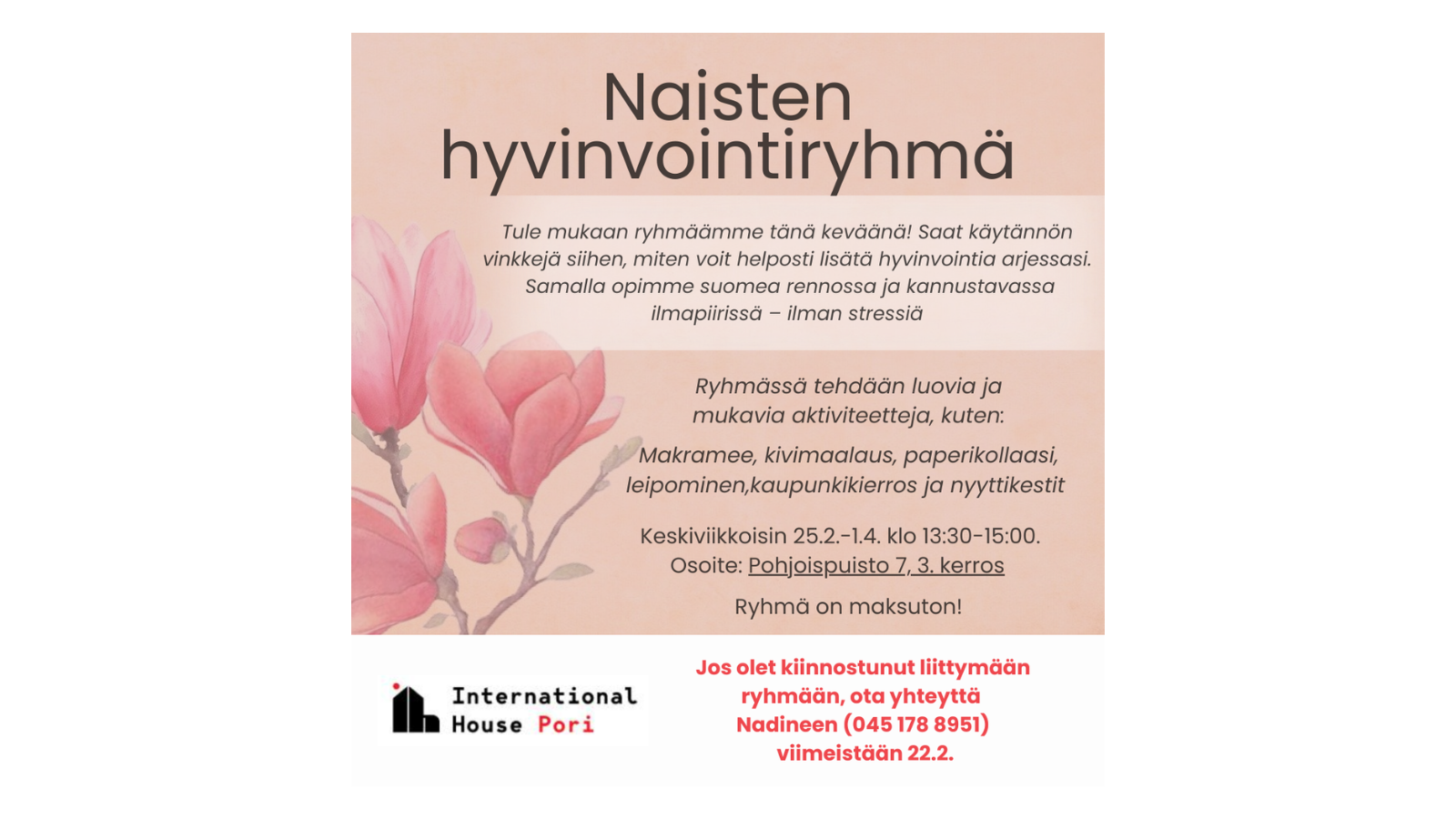 Tule mukaan ryhmäämme tänä keväänä! Saat käytännön vinkkejä siihen, miten voit helposti lisätä hyvinvointia arjessasi. Samalla opimme suomea rennossa ja kannustavassa ilmapiirissä – ilman stressiä. Ilmoittautuminen Nadinelle 22.2. mennessä.